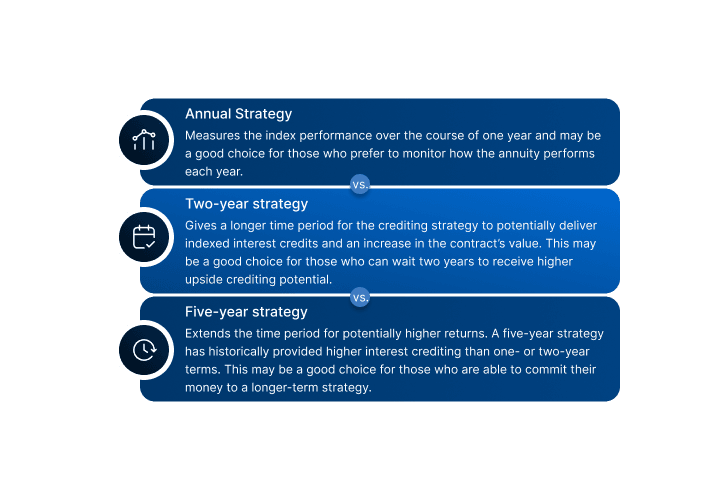 Once the crediting strategy is determined for an index, the next step is to choose how often interest gets credited. You determine index performance by comparing the index’s value on the first day of the indexing time period to its value on the last day (point-to-point).
